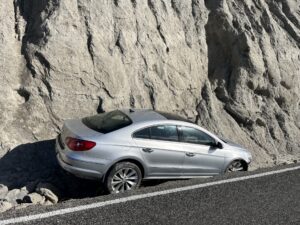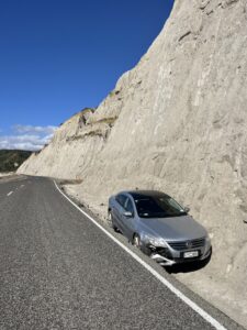 Auf dem Rückweg entdeckten wir mal wieder ein zurückgelassenes Auto, das sich komplett in einem steilen Felsabgrund festgefahren hatte. Wie das da hingekommen ist? Keine Ahnung. Aber Neuseeland überrascht uns wirklich jeden Tag aufs Neue. 😅🚗🪨