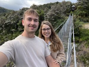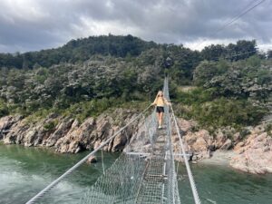 Los ging es weiter nach Westport. Schon nach 15 Minuten mussten wir jedoch anhalten – die Buller Gorge Swing Bridge wartete auf uns. Sie ist die längste Hängebrücke Neuseelands, rund 110 Meter lang und führt spektakulär über den türkisfarbenen Buller River. Beim Überqueren schwankt sie leicht, was das Ganze noch aufregender macht. Die Aussicht in die tiefe Schlucht ist einfach unglaublich – ein Mix aus Nervenkitzel und Natur pur. 🌉😲🌿
