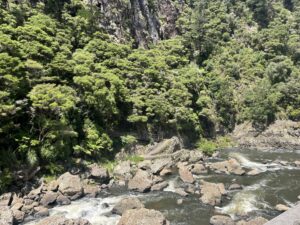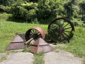 Unsere erste Anlaufstelle des Tages war die Karangahake Gorge. Die Schlucht verbindet beeindruckende Natur mit sichtbar erhaltener Goldgräbergeschichte: Entlang des Flusses führt der Track über alte Brücken und durch einen ehemaligen 1-km-Eisenbahntunnel, in dem früher tonnenweise Gestein für die Goldgewinnung transportiert wurde. Heute hat sich die Natur vieles zurückerobert, wodurch die Mischung aus Wald, Flussrauschen und vergessenen Minen einen ganz besonderen, fast mystischen Charme hat. 🌿🌉⛰️