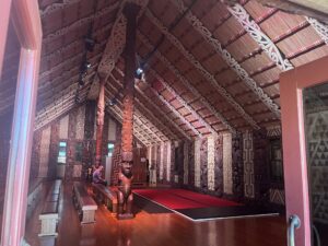 Am Ende des Weges kamen wir beim Te Rau Aroha Museum heraus, das wir uns nicht entgehen ließen. Wie schon in der Art Gallery Auckland hatten wir wieder Glück und erwischten eine kostenlose Führung – der Eintritt war diesmal allerdings nicht frei. Es war ganz nett, aber für mich kein Must-Do. Die Ausstellung zeigte viel über den Militärdienst der Māori, persönliche Erinnerungsstücke, Geschichten des 28th (Māori) Battalion und eindrucksvolle Gedenkräume. Auf dem Waitangi-Gelände selbst gehören außerdem das große Wharenui (Versammlungshaus), der Māori-Tempel und das beeindruckende zeremonielle Waka (Kriegskanu) zu den wichtigsten Sehenswürdigkeiten. 🏛️