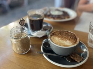 Nach dem kleinen Herzinfarkt ging’s weiter nach Kerikeri ins Jerusalem Café, ein israelisches Café/Restaurant. Erst bestellten wir Kaffee – ich hatte einen typischen, sehr starken Schlammkaffee mit Kardamom. Danach gab’s Pitabrot mit Tomaten und Basilikum als Vorspeise. Als Hauptgericht teilten wir uns Reis, Falafel, Lamm, Rindfleisch, Hummus und verschiedene Dips. Super lecker. 🍽️😋