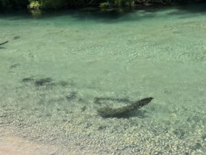 Dann ging’s weiter über den Hühnerstall und durch den 4 Hektar großen Wald, vorbei am pensionierten Trüffelschwein (7 Monate alt). Unten am Privatstrand angekommen – wow! Ich gönnte mir ein eiskaltes Bad im glasklaren Fluss, gefühlt 8 Grad. ❄️🏞️🛁