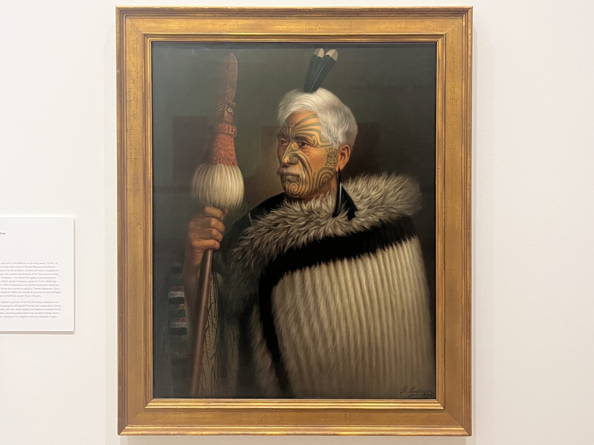 Mein persönlicher Favorit ist eine Zeichnung eines Māori-Häuptlings. Die Tā moko sind traditionelle Tätowierungen, die ein Merkmal für die Identität hochrangiger Māori sind. Die schwarz-weißen Schwanzfedern des Huia-Vogels waren das höchste Statussymbol in der vorkolonialen Māori-Welt. Sie wurden im Haar getragen und waren nur Personen mit hohem Rang oder außergewöhnlichen Leistungen vorbehalten. Ein weiteres Indiz waren Kleidungsstücke aus Hundsfell mit Federn von Kiwi-Vögeln. Zudem trugen Hochrangige Bone- oder Greenstone-Schmuck (hei tiki, hei matau, kuru) als Zeichen von Rang und spiritueller Kraft. Als letztes hatten sie Waffen wie Speere.