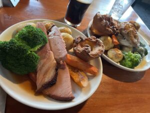 Nur ein paar hundert Meter weiter fanden wir ein richtig schönes Restaurant, Bar und Café. Erst ein Kaffee, dann ein Cider – und am Ende blieben wir direkt auch zum Abendessen. Es gab ein Christmas Special: eine Art Braten mit Kartoffeln, Karotten, Yorkshire Pudding und Fleisch – war sehr lecker. 🎄🍽️