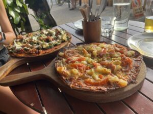 Wir parkten unseren Camper, kauften noch ein paar Dinge ein und kehrten später noch einmal ins Café zurück – diesmal zum Abendessen. Für mich gab es eine Pineapple & Bacon Pizza, eine Art Hawai Pizza, und ganz ehrlich: das war definitiv die beste Hawai Pizza, die ich je gegessen habe. 🍕😋